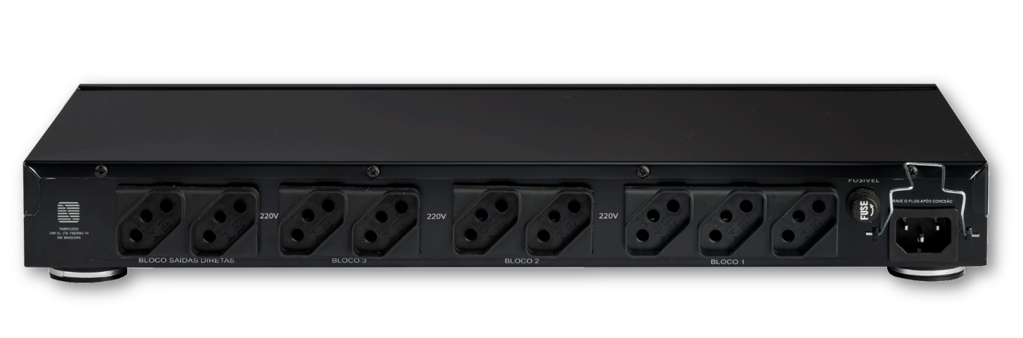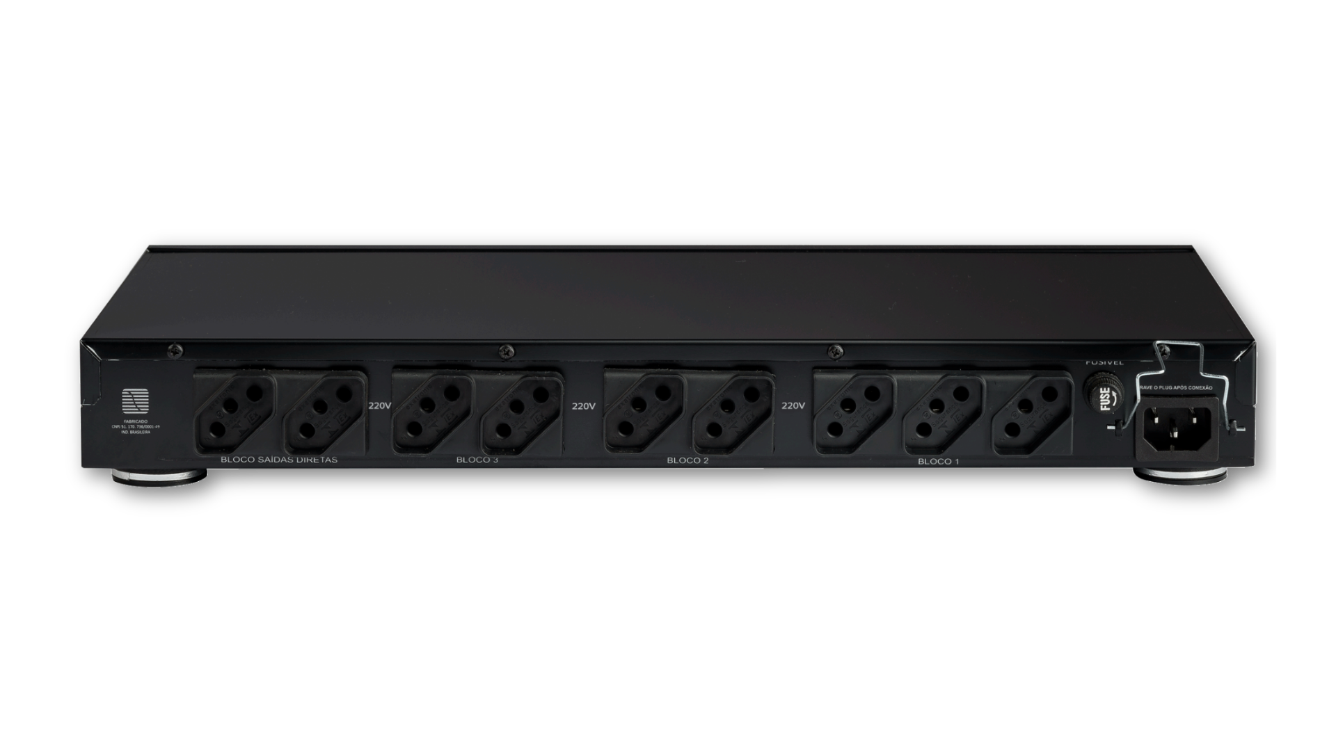 Este modelo possui 10 tomadas estrategicamente distribuídas para oferecer conveniência e organização ao seu rack. Dessa forma, as conexões traseiras são divididas em quatro grupos especializados, incluindo blocos para equipamentos de alta potência e saídas exclusivas para fontes digitais. Além disso, o dispositivo conta com tomadas diretas, que permanecem alimentadas para garantir que centrais de automação e decodificadores nunca percam suas configurações